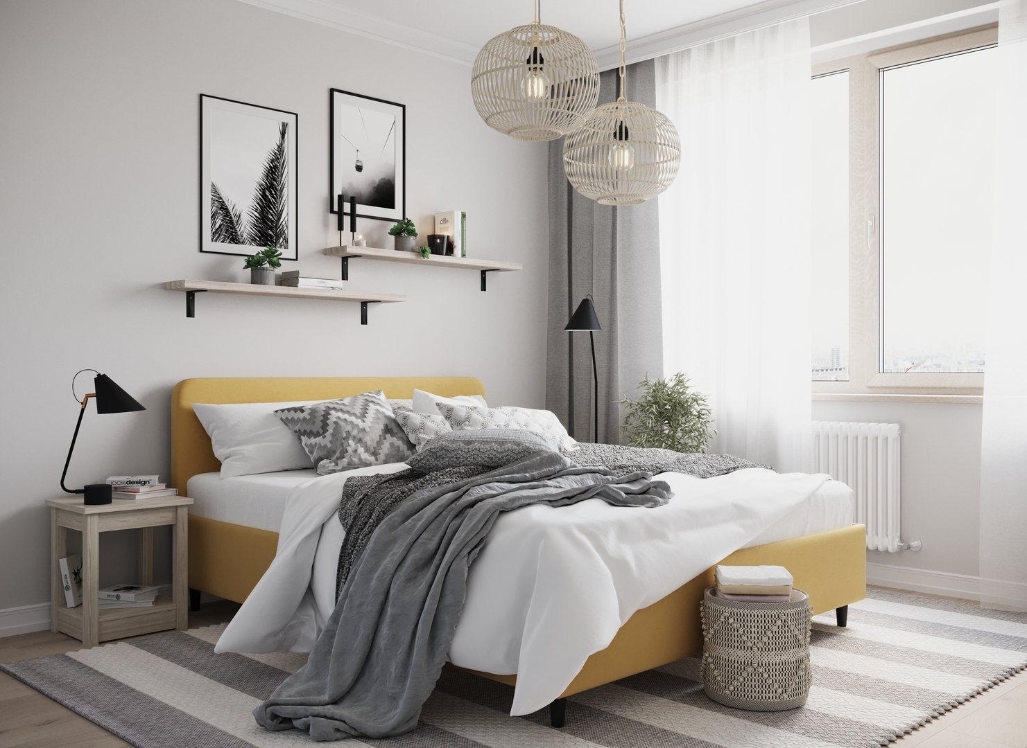 Создать гармоничный интерьер и завершить образ спальни помогут дополнительные аксессуары, например: тумбы, банкетки, подушки.